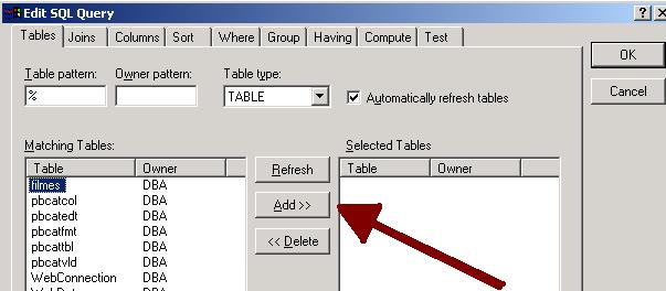 31. Na janela Edit SQL Query, em Tables selecione as tabelas onde estão armazenadas as informações que desea mostrar. Para isso, clique na tabela em Matching Tables em seguida clique no botão Add>> .