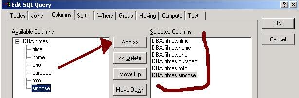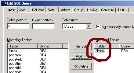 33. Agora em Columns repita o procedimento, selecionando as colunas da tabela em Available Columns em seguida clique no botão Add>>. As colunas selecionadas deverão aparecer em Selected Columns. Vários outros itens podem ser definidos utilizando Joins, Sort, Where, Goup, Having e Compute.