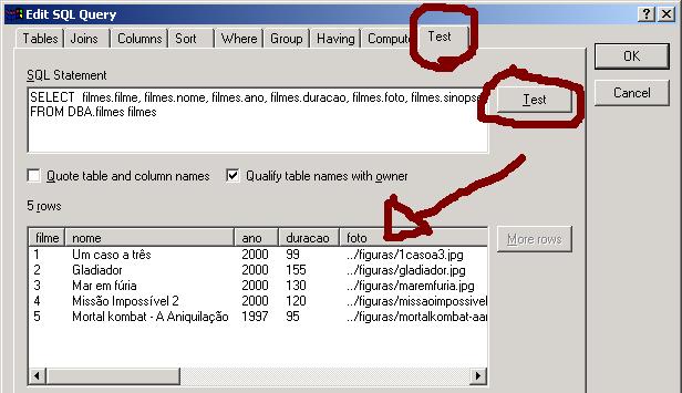 34. Em Test , é possível ver a instrução SQL em SQL Statement. Também é possível testar a instrução SQL clicando no botão Test, o resultado aparecerá na parte inferior da janela como mostra a seta da figura abaixo :