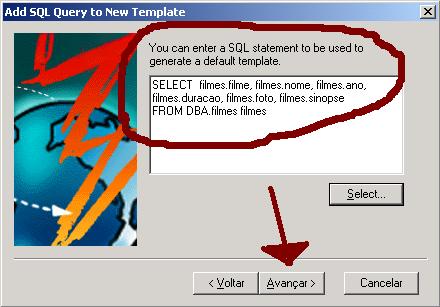35. Na janela Add SQL Query to New Template temos a instrução SQL resultante dos passos 30 a 33. Clique no botão Avançar.