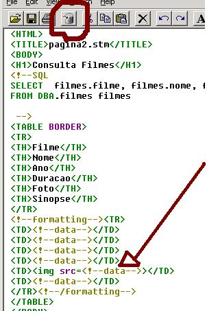 40. Na coluna foto da tabela filmes temos a url do gif que está dentro do banco de dados. Basta uma pequena alteração no código html para que apareça a foto. A alteração deve ser feita como mostra a seta da figura abaixo. Em seguida para salvar as alterações clique no botão Save to Database marcado com um círculo na figura abaixo.