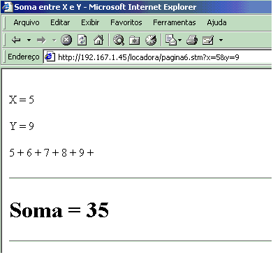 56. ATENÇÃO : Na hora de fazer o teste você deve digitar no browser após a URL da página as 2 variáveis com seus respectivos valores, veja : http://192.167.1.45/locadora/pagina6.stm?x=5&y=9 O endereço IP + /locadora + o nome da páginas + ?