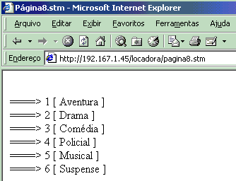 62. Para fazer o teste acesse no browser a página : http://192.167.1.45/locadora/pagina8.ssc , e como resultado aparecerá a página pagina8.stm mostrando os dados armazenados pelo script pagina8.ssc , veja :